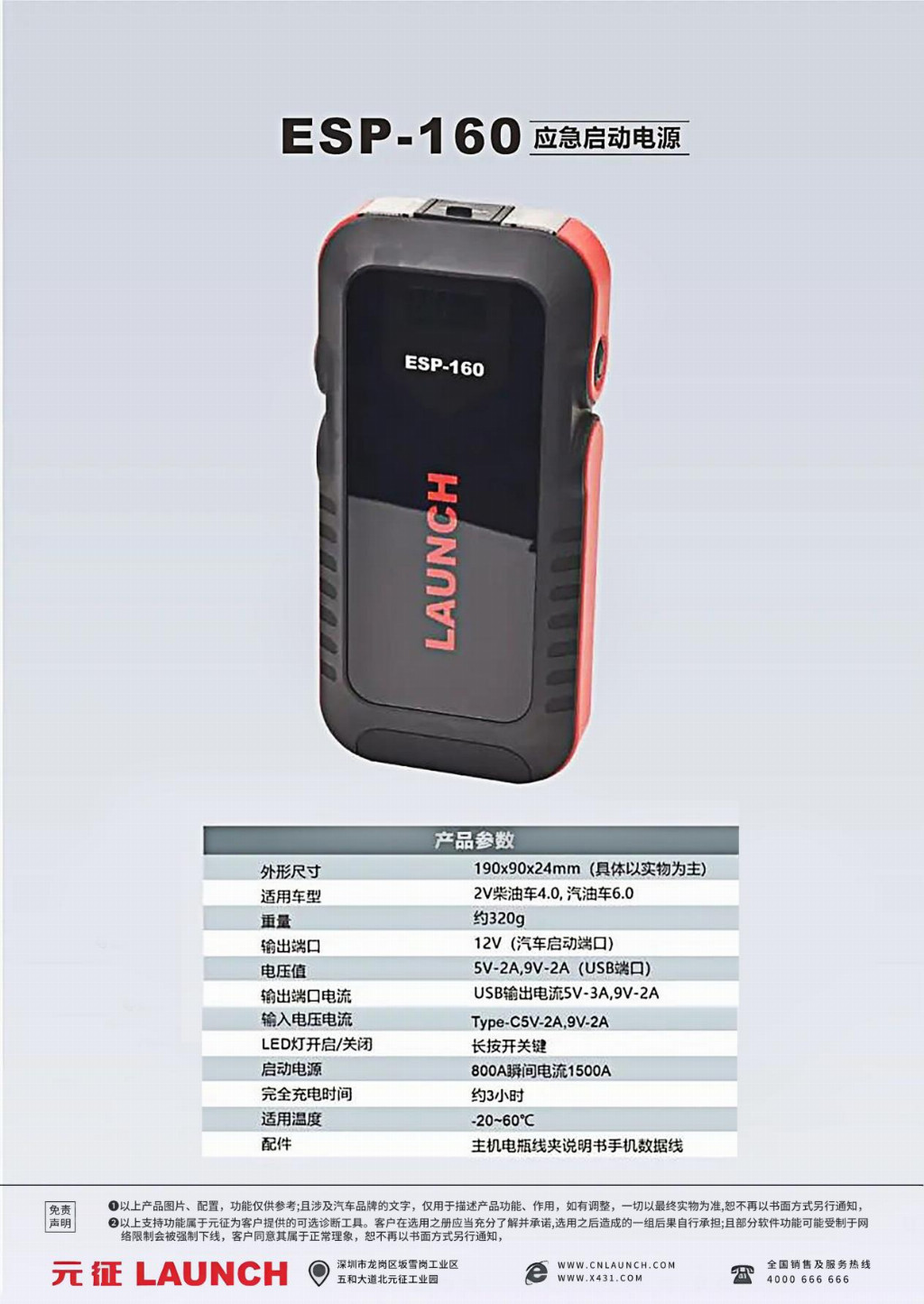 元征作为知名品牌,始终秉持着严谨的生产态度与卓越的创新精神。ESP - 160 应急启动电源产自深圳龙华新区民治街道工业路云里智能园云里天工工场,依托元征强大的技术研发与生产实力,从研发设计到生产制造,每一个环节都严格把控,确保产品质量。同时,元征还提供完善的售后服务,全国服务热线 4000 666 666 随时为您解答疑问,让您在使用产品的过程中无后顾之忧。